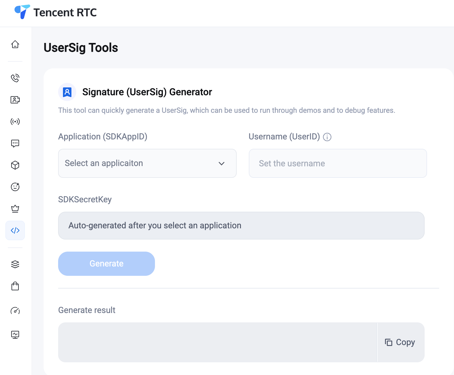 1. 登录 TRTC 控制台,在概览面板页面的左侧目录选择开发工具 > UserSig 工具。