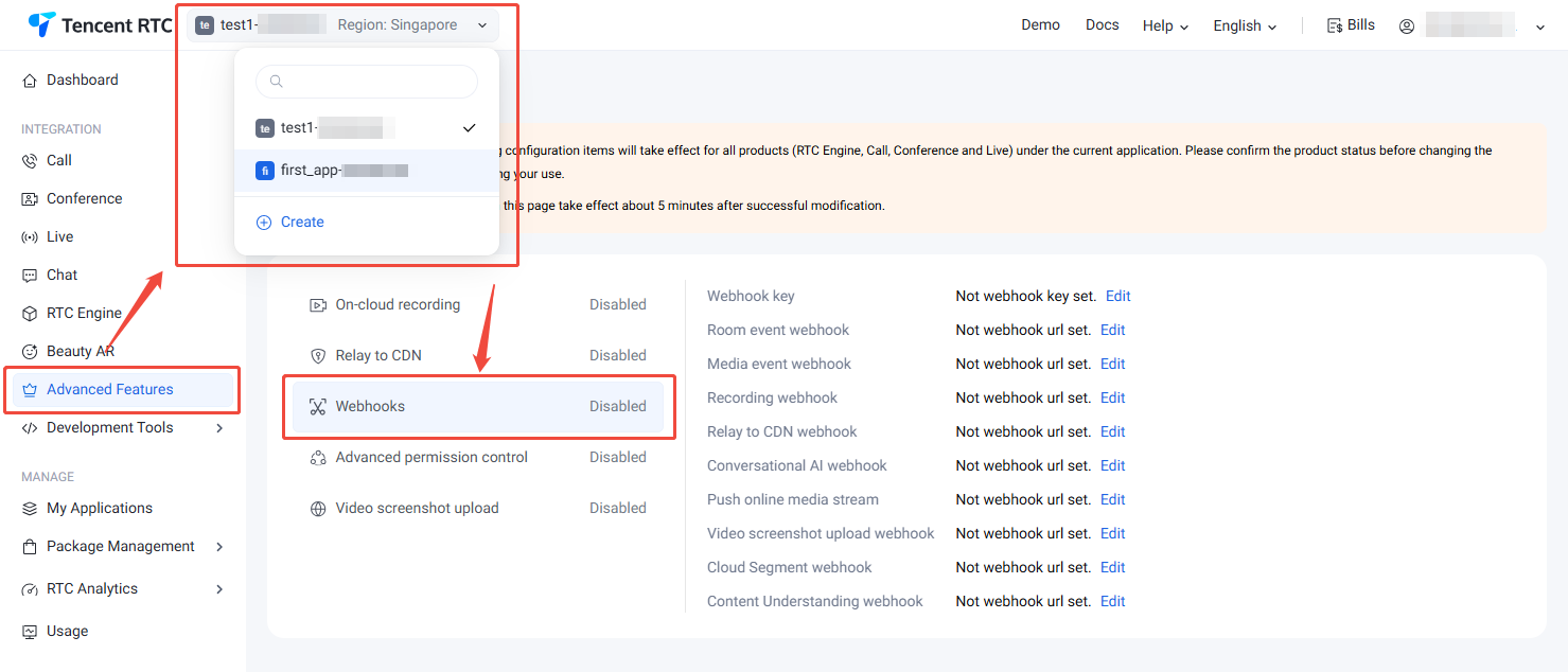 1. 进入 Tencent RTC 控制台 > Advanced Features,在左上角选择目标应用。同时,您也可点击 Create 在此快速创建新应用。