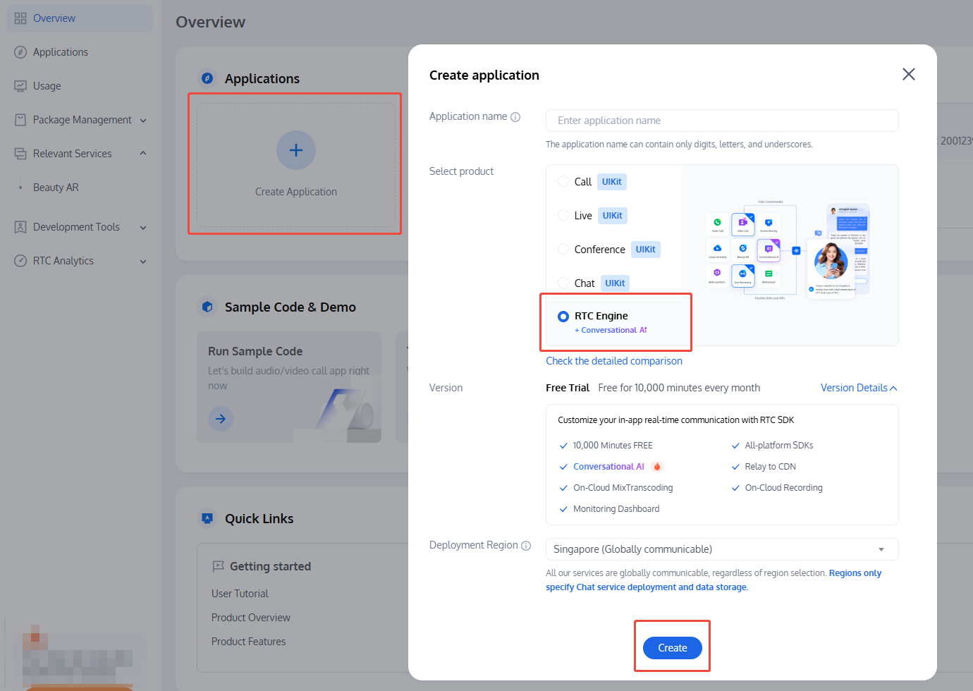 3. 在创建弹窗中,输入您的应用程序名称,选择 RTC Engine,点击 Create。