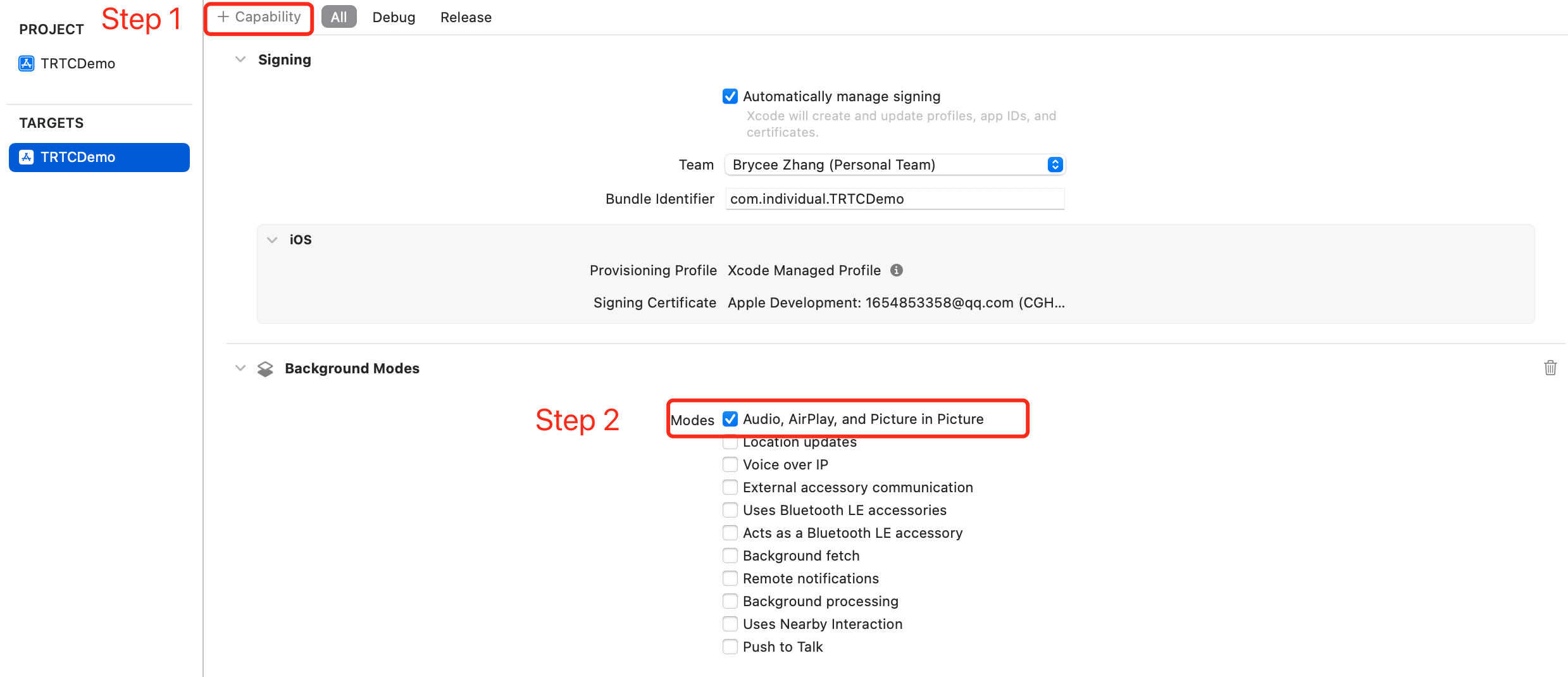 Signing & Capabilities 选项卡中添加 Background Modes,并勾选 Audio,AirPlay and Picture in Picture,以允许应用在后台运行音频、AirPlay 和画中画功能。