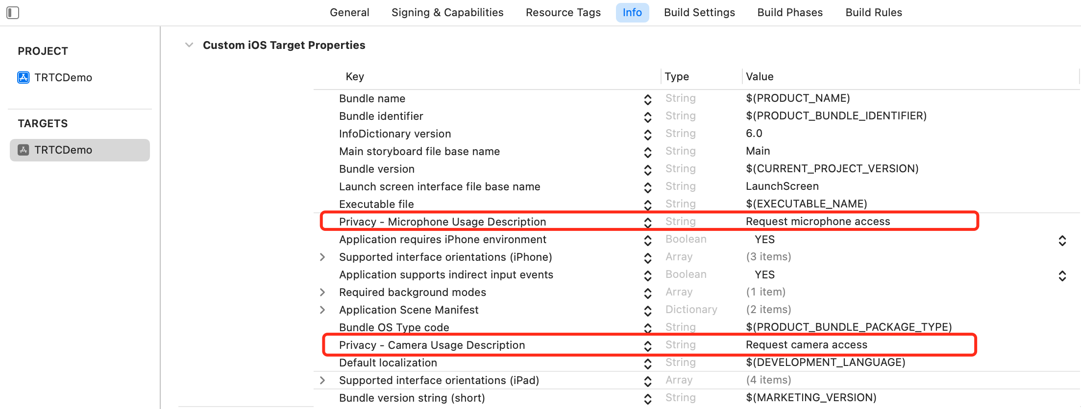Info.plist 选项卡中添加 Privacy-Microphone Usage Description 和 Privacy-Camera Usage Description ,并填入 Microphone/Camera 使用的目标提示语,获取麦克风和摄像头的使用权限。