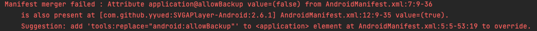 AndroidManifest合并过程中产生属性冲突,您需要在 app/src/main/AndroidManifest.xml 文件的 <application> 节点中,添加 tools:replace="android:allowBackup" 和 android:allowBackup="false",用以覆盖组件内的设置。<application...// 添加如下配置覆盖 依赖的 sdk 中的配置android:allowBackup="false"tools:replace="android:allowBackup">