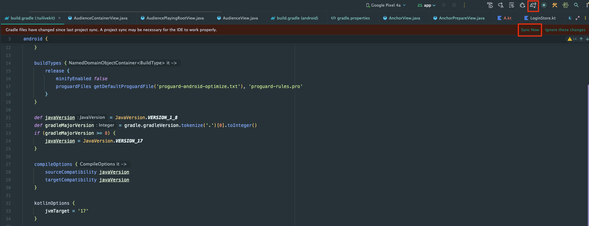 Android Studio 会自动为您弹出 Sync Now 按钮,您需要点击该同步按钮完成项目的同步,若 IDE 没有自动弹出同步按钮,请您手动点击工具栏中的同步按钮进行项目的同步,同步后 IDE 会完成项目的构建配置和索引等工作,您就可以在您的项目中正常使用 TUILiveKit 组件了。