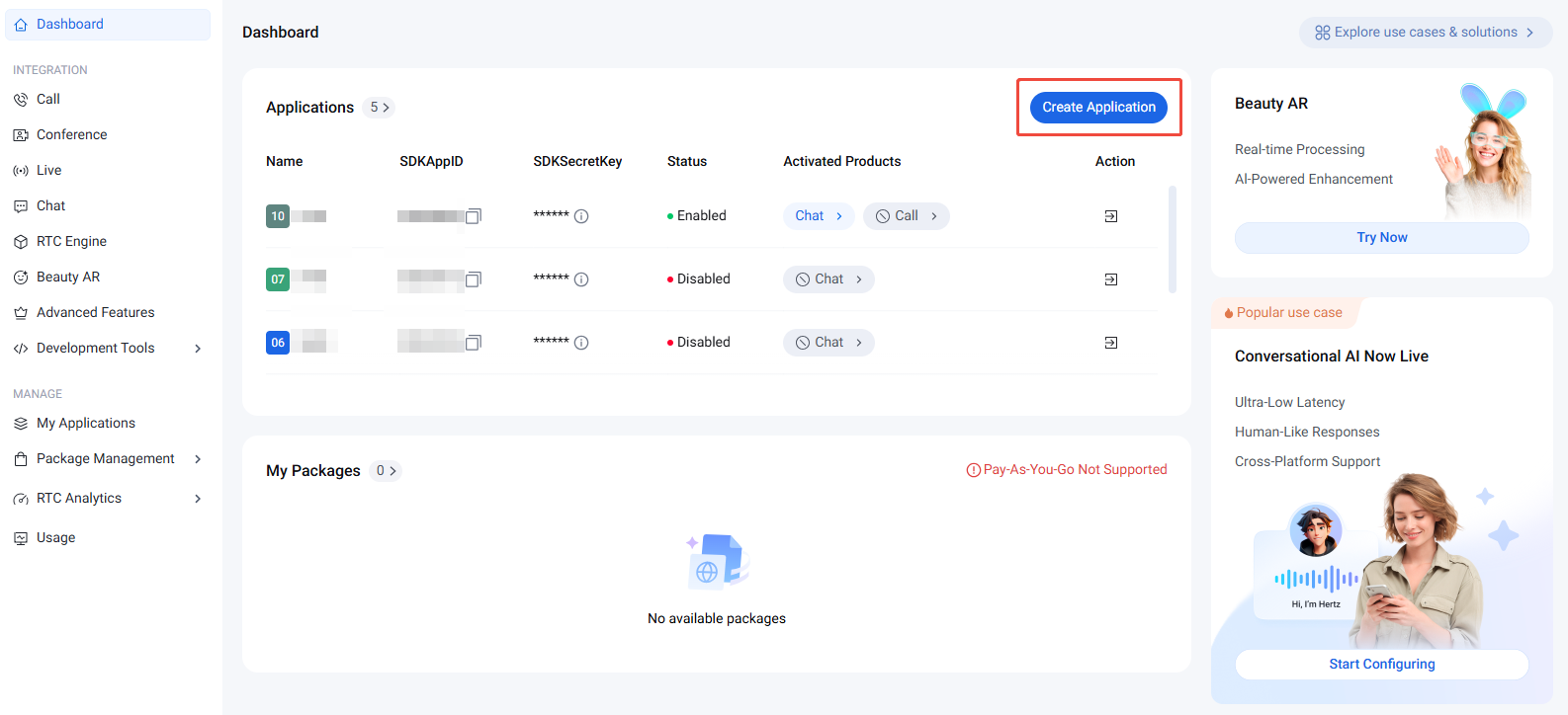 2. 登录 即时通信 Chat 控制台,单击 Create Application