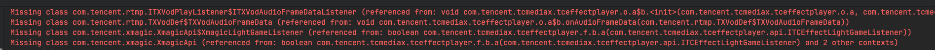 -dontwarn com.tencent.rtmp.ITXVodPlayListener$ITXVodAudioFrameDataListener-dontwarn com.tencent.rtmp.TXVodDef$TXVodAudioFrameData-dontwarn com.tencent.xmagic.XmagicApi$XmagicLightGameListener-dontwarn com.tencent.xmagic.XmagicApi
